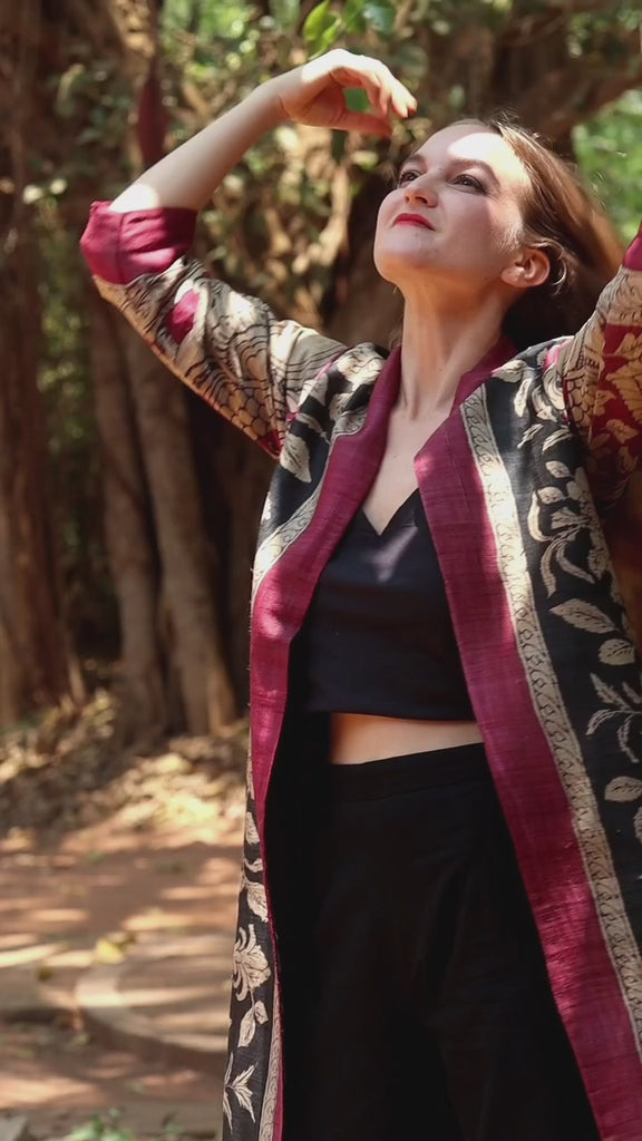 Hand-painted Kalamkari long jacket in rich Tussar silk. Features black base with floral motifs. A timeless, artisanal layer for festive or formal looks.